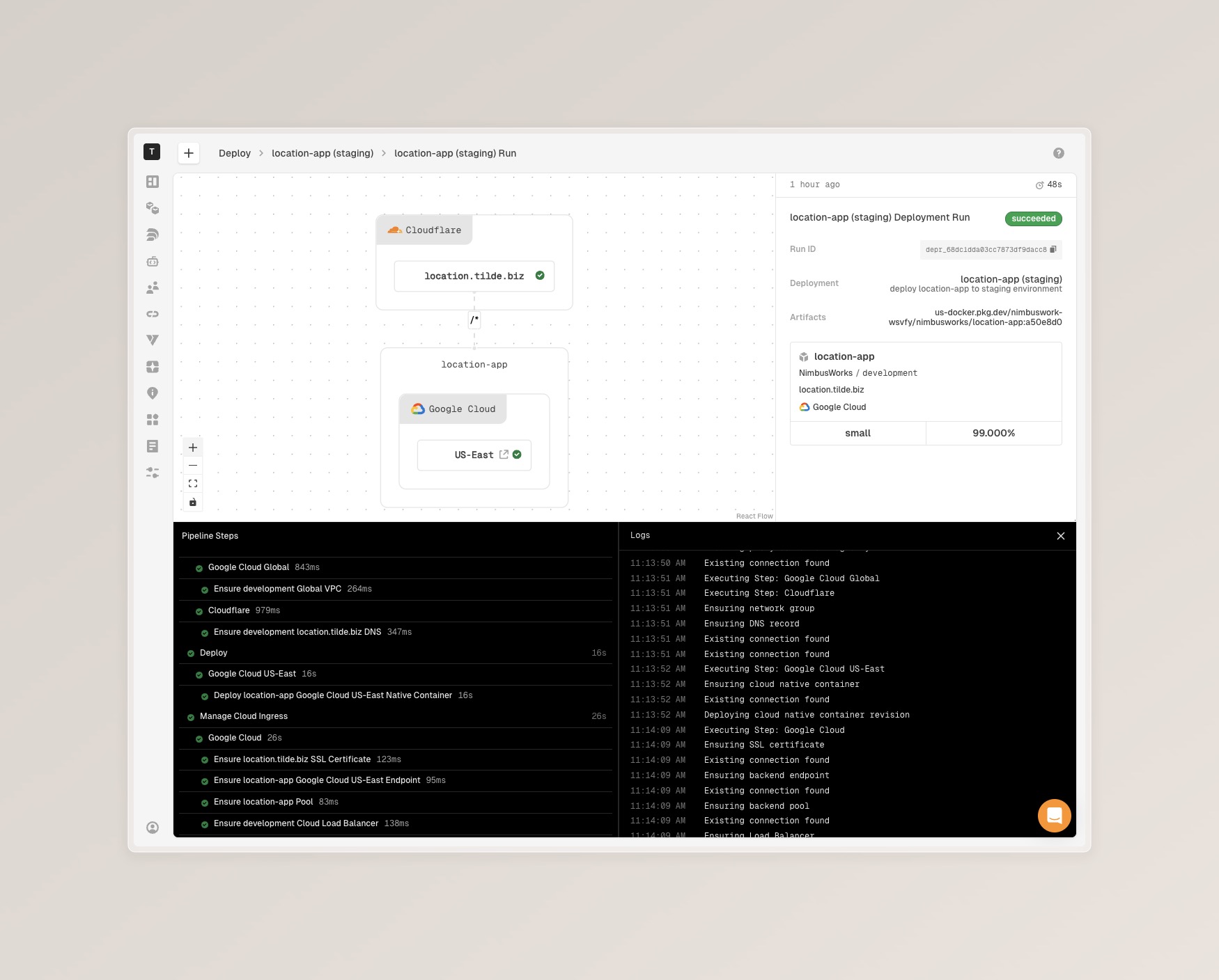 }'The response contains the deployment run record, including its ID, current status, pipeline steps, and preview URL. Follow-up calls to GET /api/organizations/{organizationId}/deployments/{deploymentId}/runs/{runId} return the latest status, and PUT /api/organizations/{organizationId}/deployments/{deploymentId}/runs/{runId}/status (body { "status": "canceled" }) lets you cancel a run that is still in progress.